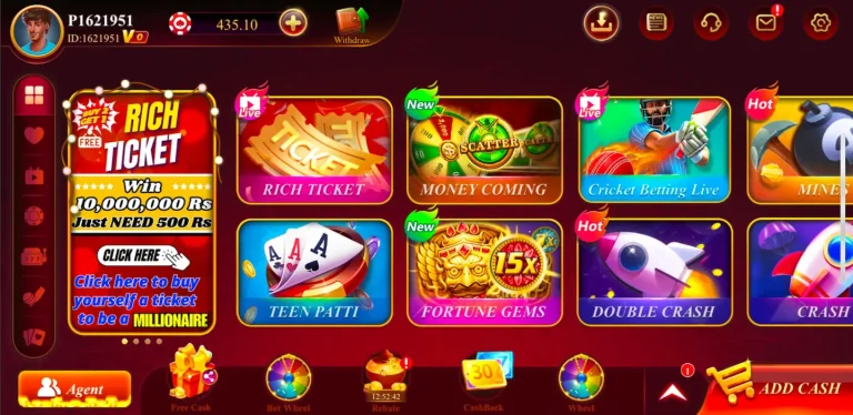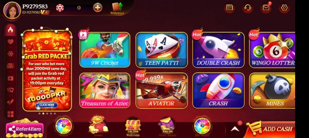 We offer a wide variety of games including Teen Patti, Dragon Tiger, Ludo, Mines, Roulette, and many more real-money slots and card games.