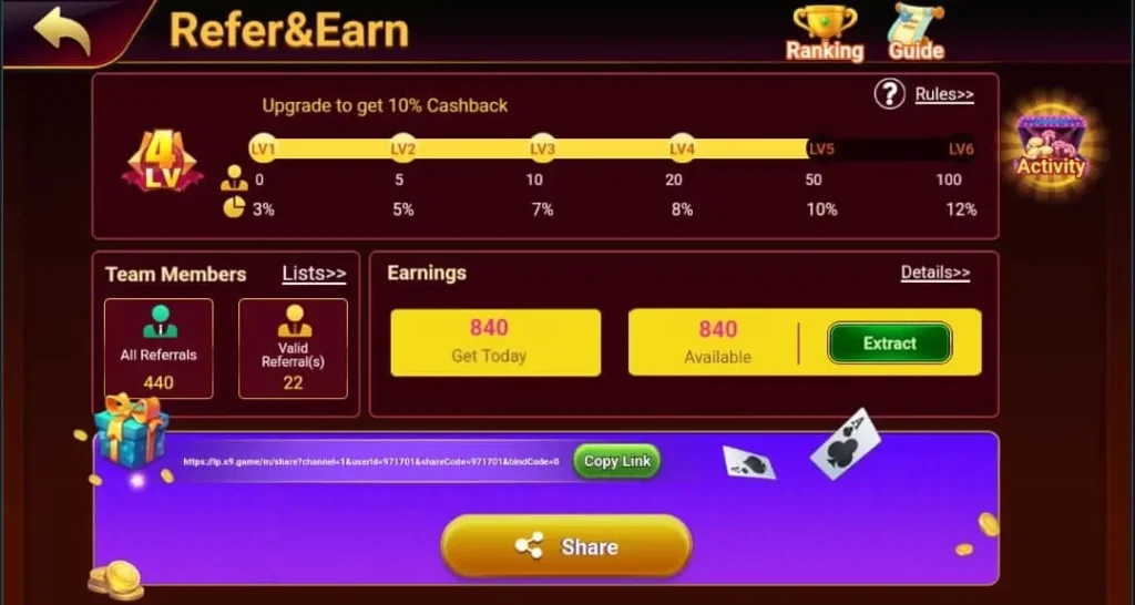 You can find your unique referral link in the 'Refer & Earn' section of the app. Share this link with friends, and you'll earn a commission every time they play.